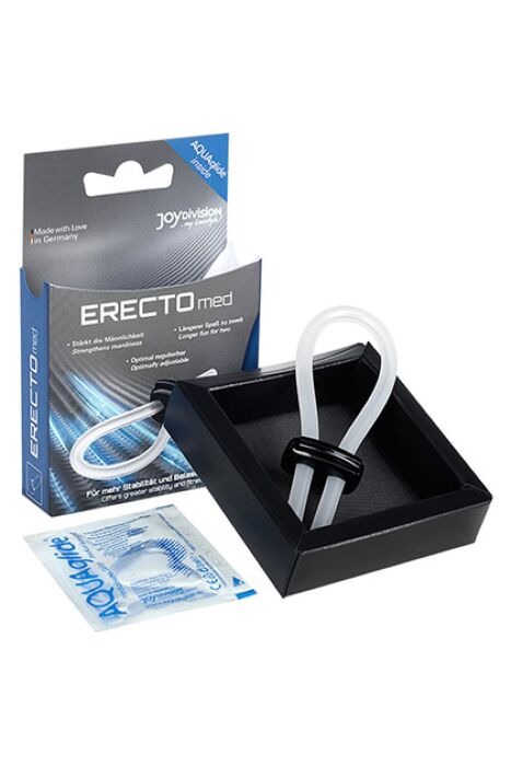 Mets l'anneau en place lorsque tu es en érection partielle ou complète, en veillant à ce que la sensation reste confortable. Utilise le réglage progressif d'une seule main pour serrer juste assez: l'objectif est de soutenir la circulation pour conserver la rigidité, pas d'engendrer une douleur ou un engourdissement. Tu peux aussi le positionner derrière les testicules pour un effet testiculaire supplémentaire. Le produit inclut une monodose de lubrifiant Aquaglide pour un premier essai.