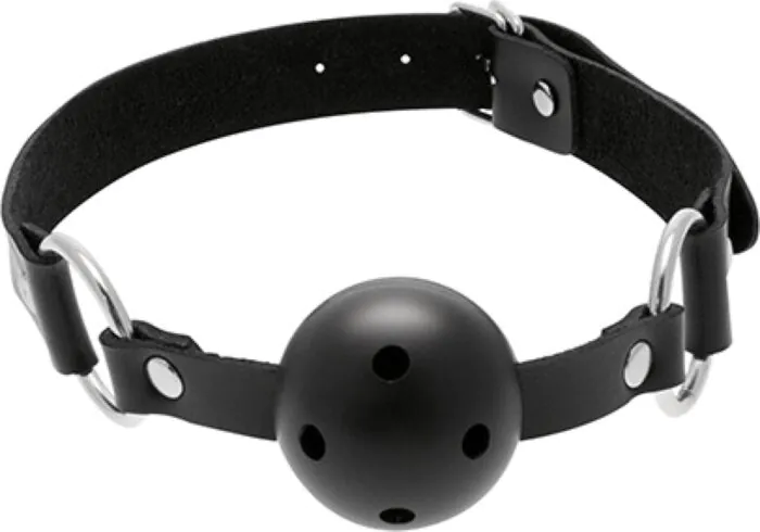 C'est un bâillon boule destiné aux amateurs de jeux de domination et soumission qui privilégient la respiration et le confort. La sphère en gomme souple offre une prise en bouche ferme sans rigidité excessive, et ses ouvertures permettent de respirer plus facilement qu'avec une boule pleine. Les anneaux métalliques relient la boule à une lanière en cuir, fermée par une boucle ajustable pour s'adapter à plusieurs tailles de tête.