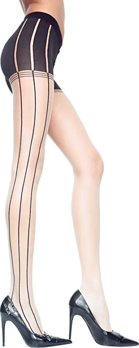 Bas féminins signés Music Legs, pensés pour apporter une ligne graphique subtile grâce à des fines rayures noires sur les côtés. Parfaits si tu veux rehausser une tenue habillée ou ajouter une touche rétro-sophistiquée sans en faire trop. Conviennent aux looks de soirée et aux tenues chics où l'on veut allonger visuellement la jambe.