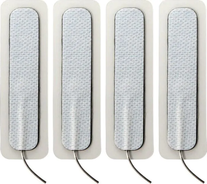Quatre électrodes auto-adhésives unipolaires, plus longues et plus fines que les pads carrés : parfaites si tu veux cibler lèvres, périnée ou base du pénis. Surface réduite = sensations plus intenses et précises. S'utilisent en paire sur un même canal pour partager ou concentrer la stimulation.