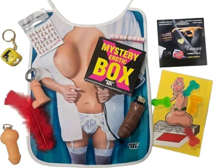 La boîte contient une variété d'articles humoristiques et érotiques tels qu'un jabon, des dés de postures, et d'autres gadgets surprenants. Chaque boîte est distinctive, donc la sélection peut varier.