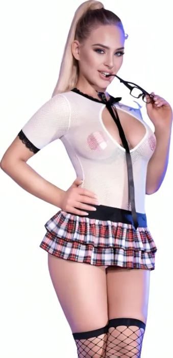 Conjuguant séduction et innocence, le costume d’écolière Chilirose CR 4364 est fait en douce maille blanche qui épouse parfaitement les courbes. Le body se noue au cou par un long ruban noir, pour un décolleté audacieux, tandis que la délicate dentelle ajoute une note d'élégance. La jupe courte à plis écossais rend l'ensemble particulièrement ludique et sexy.