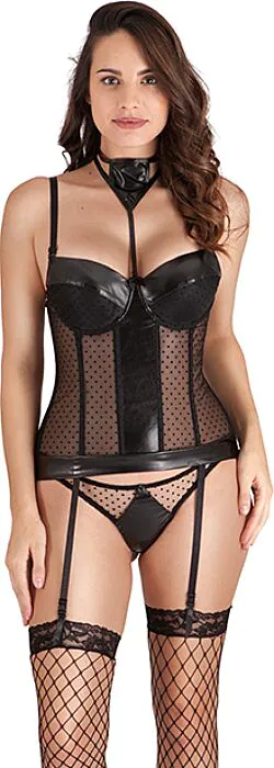 Voici un ensemble pensé pour celles qui veulent frapper visuellement. Tu as un bustier muni d’armatures et de bretelles fines réglables qui structure le buste, un porte‑jarretelles intégré pour poser les bas résille, un string assorti avec petit nœud décoratif et un accessoire de cou amovible qui met le décolleté en valeur. Le tissu est semi‑transparent à pois, avec insertions effet cuir noir pour un contraste marqué.