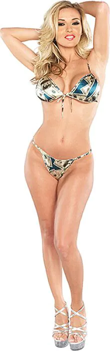 Voici un ensemble deux pièces qui joue la carte de l'humour et du charme: un soutien-gorge sans armature en tissu fin qui épouse le galbe grâce à son système de laçage, accompagné d'une culotte assortie au même imprimé billets de dollar en tons verts. C'est une pièce pensée pour celles et ceux qui cherchent une lingerie ludique, facile à enfiler et qui met l'accent sur le visuel plutôt que sur un maintien structuré.
