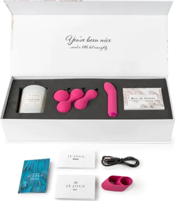 | Contenu du coffret | Bullet G‑spot + manchon pour doigt, jeu de boules Kegel Ami 3 étapes, bougie de massage Jasmine & Lily, Box of Treats |