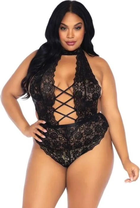 Teddy grande taille signé Leg Avenue Teddies : dentelle florale avec ouverture et laçage frontal pour un effet sensuel et ajustable. Conçu en 90% nylon / 10% spandex, il épouse les formes grâce à son élasticité tout en gardant une allure raffinée. Pour celles qui cherchent une lingerie séductrice, confortable et facile à porter.