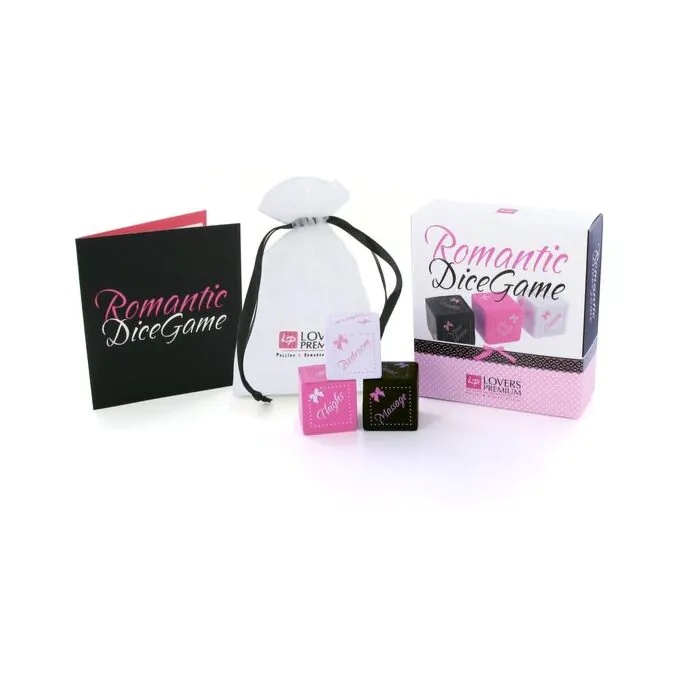 Tire los tres dados (rosa para la parte del cuerpo, negro para la acción, y blanco para el lugar) y disfrute de una magnífica noche romántica.