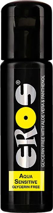 Aqua Sensitive de Eros est un lubrifiant à base d'eau, formulé sans glycérine et sans huiles essentielles. Enrichi en aloe vera et panthénol, il hydrate la peau tout en offrant une lubrification durable. Parfait si tu as la peau sensible ou si tu veux un gel incolore et sans goût. Si tu cherches un lubrifiant aromatisé ou à base silicone, ce n’est pas celui-là.