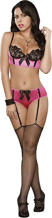 Affiche un style séduisant et conférant une sensation de luxe grâce à son tissu en satin rose associé à de délicates dentelles noires. Ce duo de lingerie se compose d'un soutien-gorge à mini corselet et d'une culotte, tous deux ornés d'un joli nœud central. Ce modèle est conçu pour celles qui recherchent l'élégance dans leur lingerie quotidienne.
