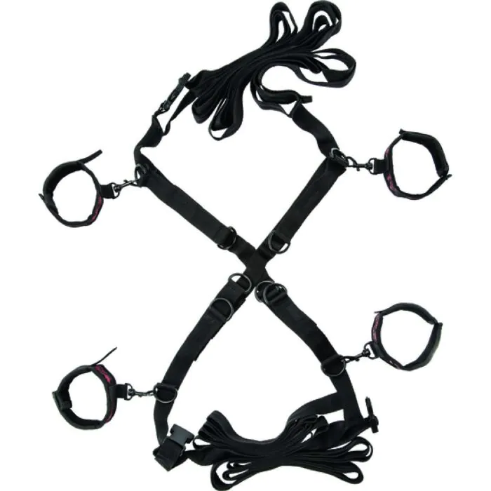 Elegante conjunto de ataduras para la cama con esposas para muñecas y tobillos para disfrutar al máximo de las más fantásticas experiencias.
