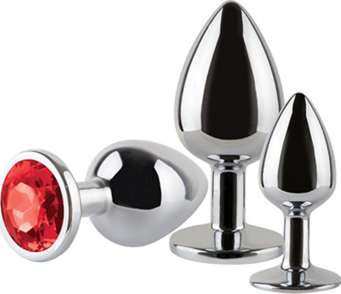 Pack de trois plugs en métal poli pour une initiation progressive à la stimulation anale. Pique par sa base ornée d'une pièce bijou circulaire, surface ultra-lisse et pointe effilée pour une insertion facilitée. Le métal permet de jouer avec la température et se nettoie en un clin d'œil. Conçu pour qui veut y aller pas à pas et cherche élégance et contrôle.
