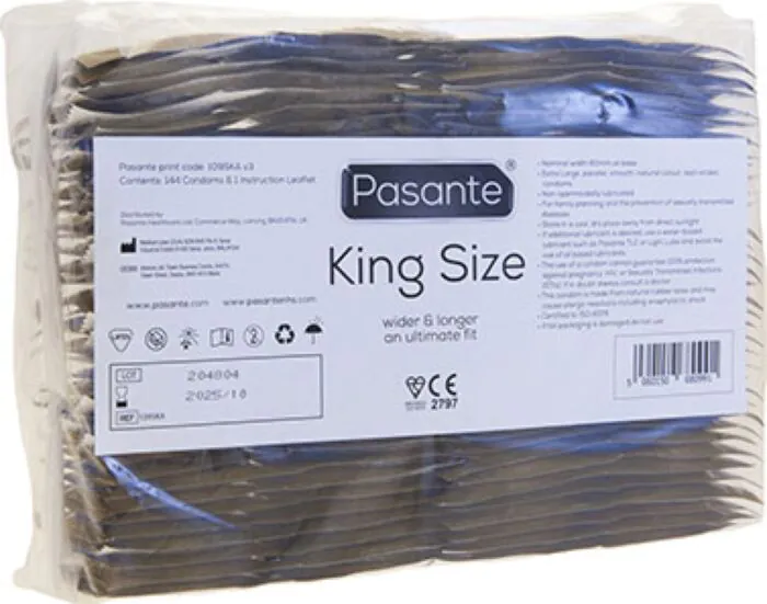 Le Pasante King Size est un préservatif en latex pensé pour ceux qui recherchent un peu plus d'espace et de confort. Avec une largeur nominale de 60 mm, il est classé « extra large »: tu ressentiras moins de contrainte qu'avec un préservatif standard. Sa forme droite avec réservoir facilite la pose et la sécurité du bout, tandis que sa surface lisse et transparente reste discrète sous la lumière.