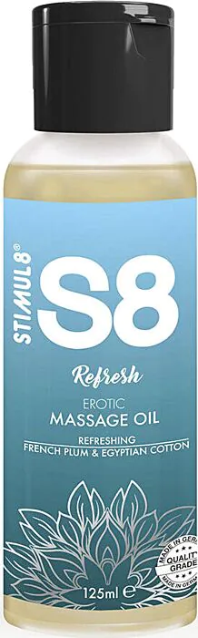 Huile de massage S8 Refresh de STIMUL8 : un mélange d'huiles végétales (jojoba, amande, sésame) enrichi en vitamines et minéraux. Conçue pour masser et nourrir la peau en douceur, elle apporte une sensation soyeuse sans parabènes ni gluten. Parfum plébiscité (ciruela française et coton égyptien). Bien pour massages intimes et corporels, attention aux allergies aux composants parfumés.
