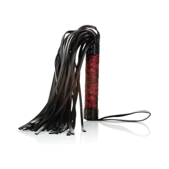 fouet en cuir avec poignée poignée recouverte d'un joli tissu rouge avec des détails floraux.