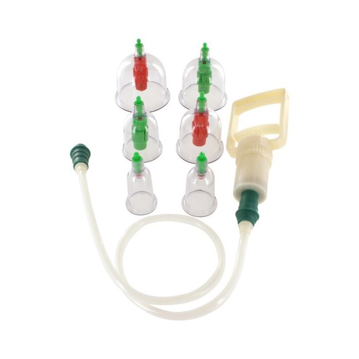 CUPPING VACUUM CUPSET, es un novedoso kit compuesto por succionadores de distinto tamaño y una bomba de mano.