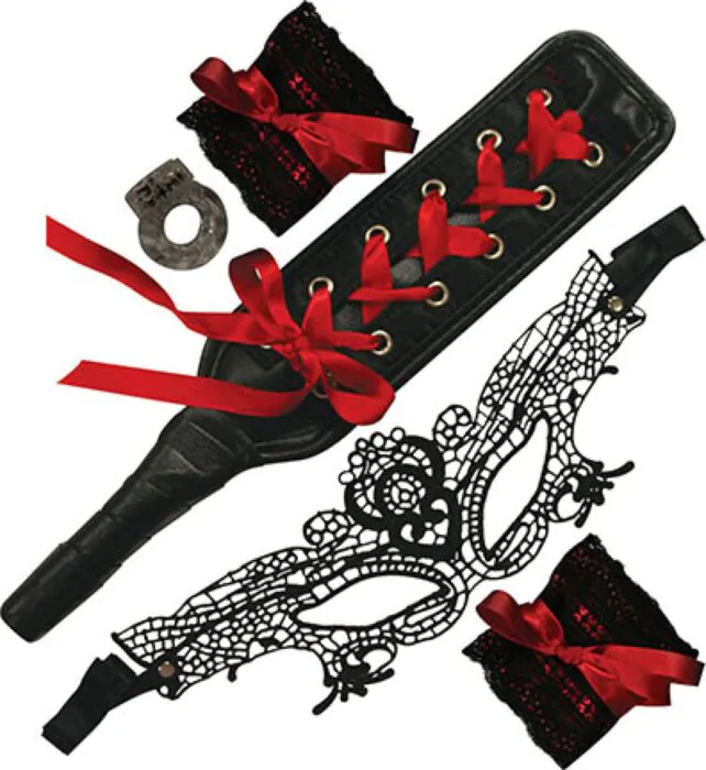 Le kit comprend des menottes en dentelle noire, une masque assortie, une paleta et un anillo vibrador pour le pénis, parfaits pour les novices.