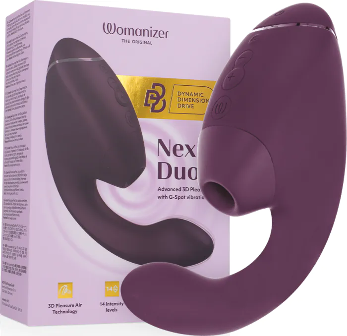 Stimulation simultanée du clitoris et du point G avec la technologie 3D Pleasure Air. Le WOMANIZER Duo Next offre une combinaison puissante de pression d'air pulsante et de vibrations profondes, pour des orgasmes d'une intensité inégalée.