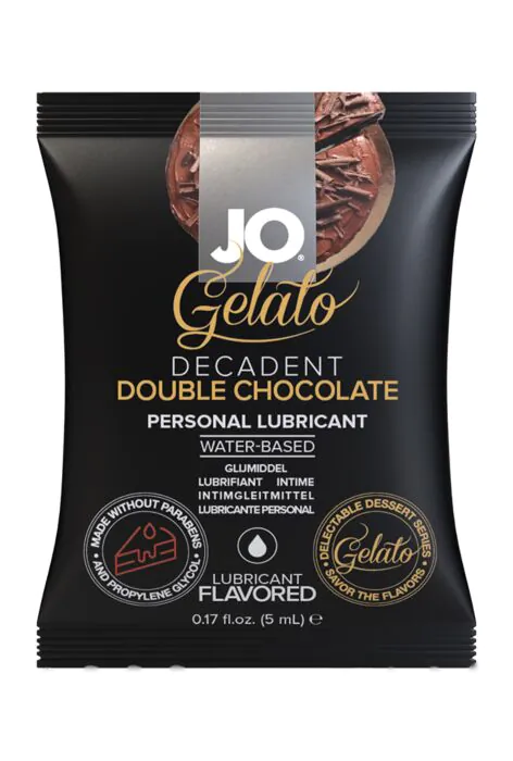 Le Sachet Gelato Decadent Double Chocolate de System JO est un lubrifiant à base d'eau présenté en format monodose de 5 ml. Tu le prendras si tu veux une touche gourmande lors de jeux oraux ou si tu as besoin d'un sachet pratique pour glisser dans une trousse de voyage. Sa texture est douce et glissante, pensée pour faciliter le contact sans laisser de film collant, et son goût mélange chocolat au lait et chocolat amer pour une note sucrée sans sucres ajoutés.